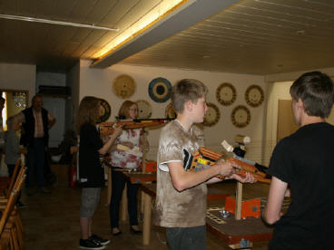Bei schönem Sonnenscheinwetter konnten einige Kinder in die Welt der Sportschützen schnuppern. Ihnen wurde ein umfangreicher Nachmittag im Schützenhaus geboten. Es wurden ihnen verschiedene Kurz- und Langwaffen erklärt und vorgeführt. Für diese Veranstaltung wurde ein Lichtpunktgewehr ausgeliehen, womit die Kinder ganz ohne Munition schießen konnten und ihre Ergebnis auf dem Monitor des dazugehörigen Laptops zu sehen war. Sie durften aber auch selber 10 Schuss mit dem Luftgewehr abgeben, wobei dann am Ende der Veranstaltung alle Schützen unter Beifall der schon wieder anwesenden Eltern mit Urkunden und Sachpreisen geehrt wurden. Auf dem 1. Platz lag Leon Borgolte, gefolgt von Benediks Obersten auf Platz 2 und Jan Henrik Larusch auf dem 3. Platz, sie bekamen zusätzlich noch Medaillen. Ein Quiz rund um das Thema Schießsport rundete den Nachmittag ab, das beste Wissen stellte Sophie Beenders, vor Benediks Obersten und Leon Borgolte unter Beweis.